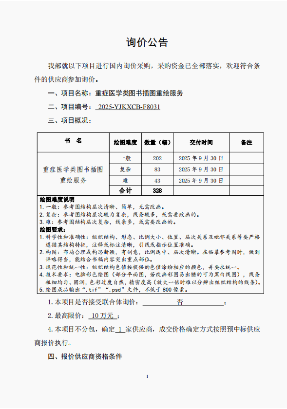 重症医学类图书插图重绘服务询价公告